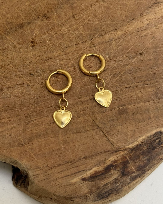• Les boucles d'oreilles "Biarritz" sont composées de créoles en acier inoxydable et de coeurs dorés en laiton