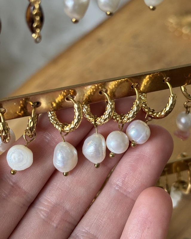 • Les boucles d'oreilles ""Big Mahini" sont composées de créoles martelées en acier inoxydable et d'une perle d'eau douce naturelle.