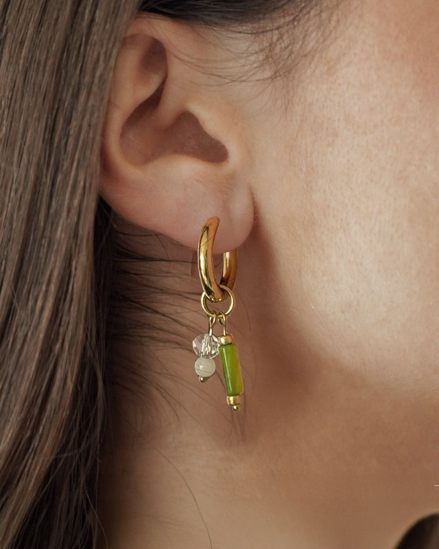 • Les boucles d'oreilles "Bohemia" sont composées de créoles en acier inoxydable et de perles vertes nacrées naturelles.