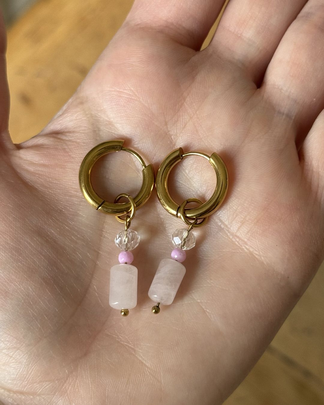 1. Les boucles d'oreilles "Hendaye" sont composées de créoles épaisses en acier inoxydable et d'une perle de quartz rose naturelle.