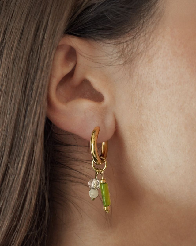 - Les bijoux "Bohemia" sont composés de perles vertes nacrées naturelles, de perles de verre beige et de charms en acier inoxydable